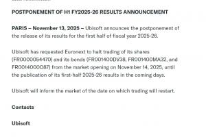 体育资讯11月14日讯 据外媒报道,育碧今日突然发布公告,宣布推迟最新财报的公布,并且暂停了股票和债券的交易。具体公布财报时间和恢复交易时间待定。