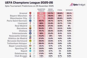 体育资讯11月25日讯 欧冠联赛阶段第5轮明日打响,Opta超算给出了最新的欧冠夺冠概率,其中阿森纳以23.09%高居第一位,拜仁15.67%紧随其后,曼城14.2%排名第三。