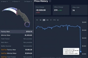 比如先前市场上较贵的武器饰品之一爪刀多普勒(Karambit Doppler),据CSGOSKINS平台显示,其价格从2700多美元骤跌到了1100多美元。