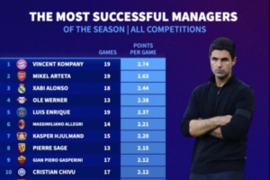 少壮派来袭!本赛季5大联赛主帅场均拿分:孔帕尼、阿尔特塔前2