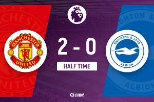 半场结束,曼联暂2-0布莱顿。