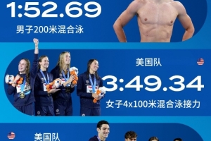 接力方面,美国队3分49秒34刷新女子4x100米混合泳接力世界纪录、美国队3分18秒48刷新了男女4x100米自由泳接力世界纪录。