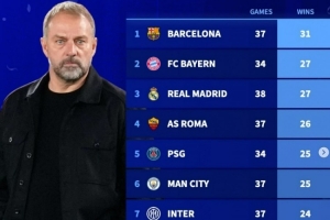 体育资讯1月1日讯 德转盘点了在2025年五大联赛中赢球场次榜,其中巴萨37场31胜居首,具体榜单如下: