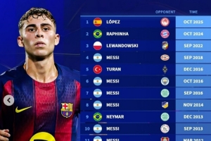 据统计,巴萨球员在欧冠历史上共计16次上演帽子戏法,具体如下:
